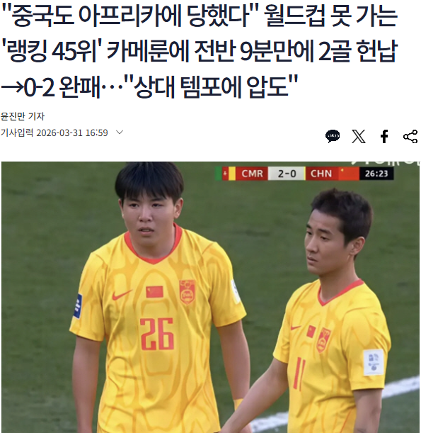 《体育朝鲜》以“中国队也被非洲球队击败,面对无缘世界杯的排名第45位的喀麦隆,上半场仅9分钟2球落后...被对方节奏完全压制”为标题进行了报道。