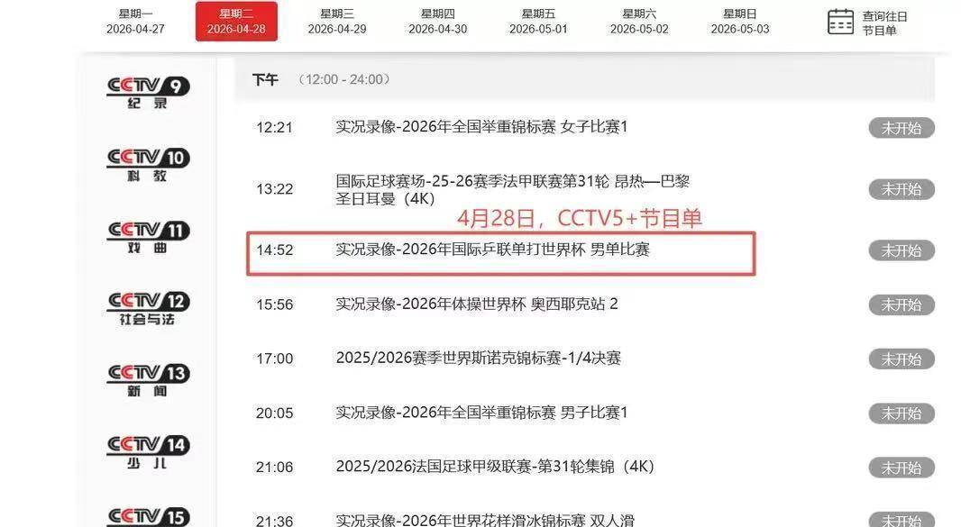 中央电视台体育频道将从5月2日国乒首场比赛开始,通过CCTV5和CCTV5+频道对赛事进行全程直播。 咪咕视频也将同步进行新媒体独家直播。 而在4月28日赛事开幕当天,CCTV5+频道安排重播了2026年澳门世界杯的精彩赛事,特别是王楚钦在男单决赛中战胜日本选手松岛辉空的比赛,为即将到来的世乒赛进行预热。