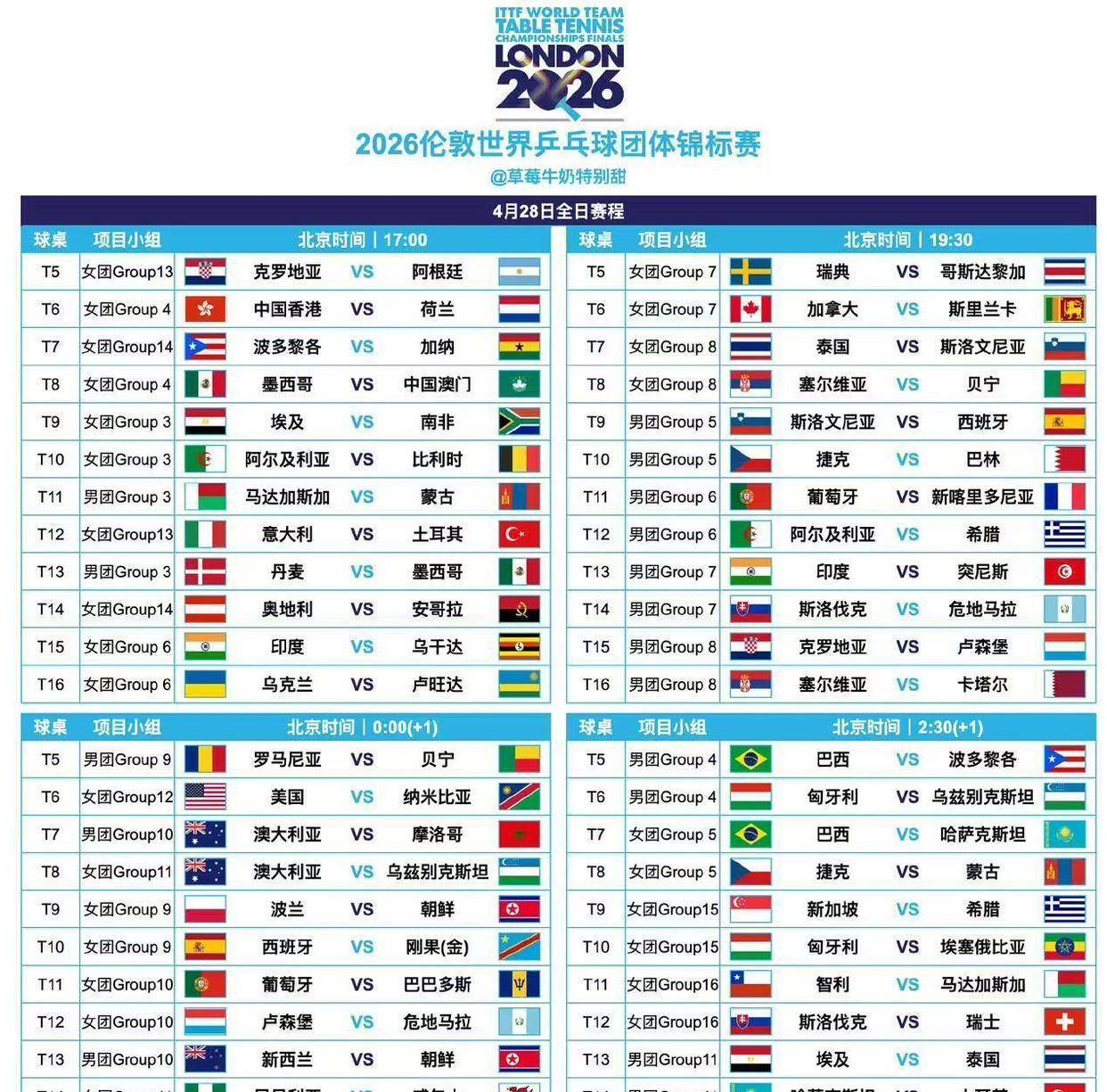 2026年4月28日,世界乒坛的目光聚焦英国伦敦。 一项拥有百年历史的赛事——世界乒乓球团体锦标赛,在它的起源地重新拉开战幕。 对于中国乒乓球队而言,这次征程意义非凡:男队将向史无前例的十二连冠发起冲击,女队则瞄准七连冠的伟业。